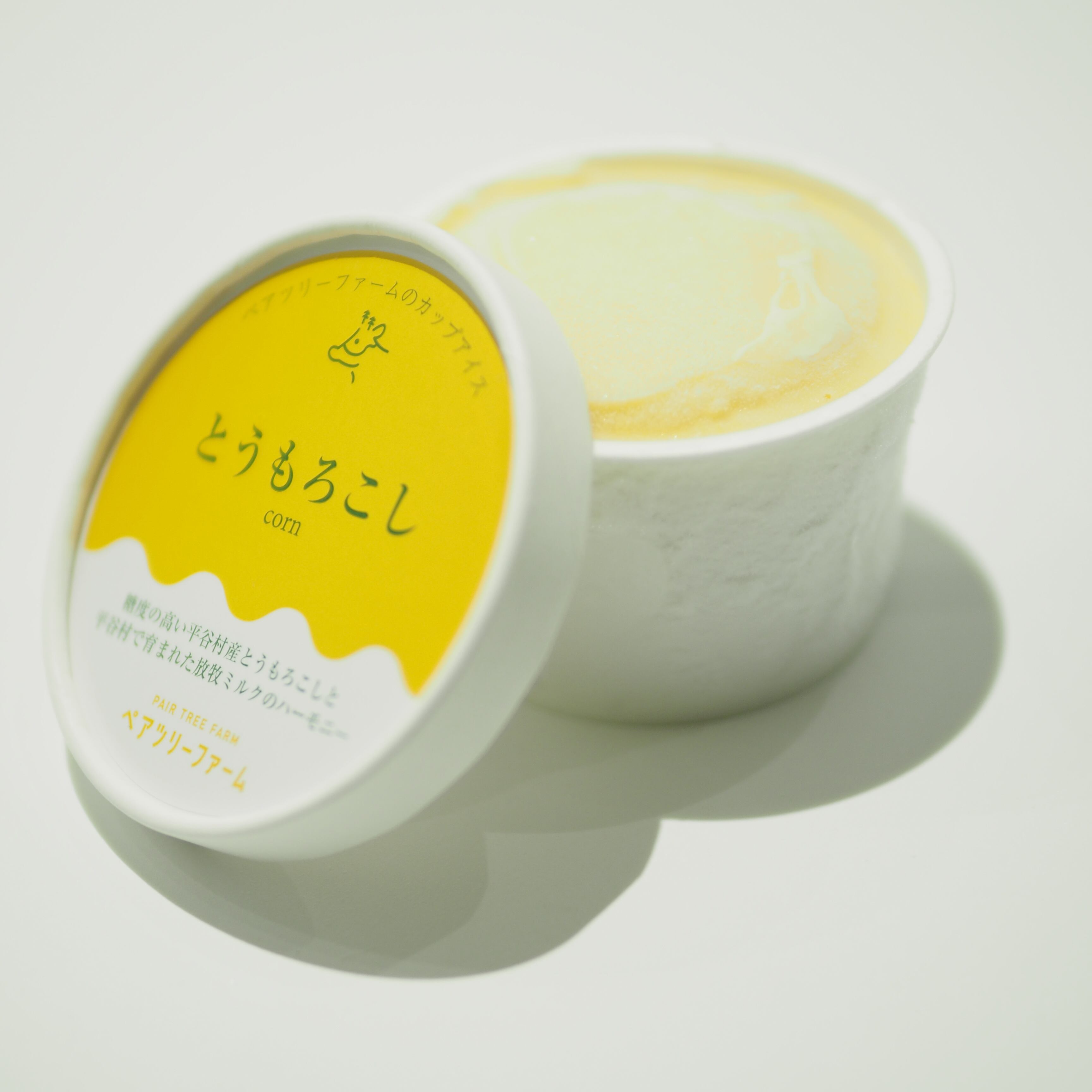 とうもろこしアイスのとうもろこしは牧場と同じく長野県平谷村産。標高900m以上の高原で育つとうもろこしは糖度が高く、ミルクとよく合います。